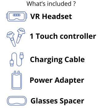1 x VR Headset , 1 x Touch Controller , 1 x Charging Cable , 1 x Power Adapter , 1 x Glasses Spacer
